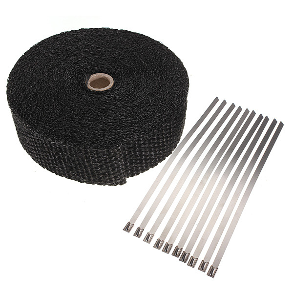 10m Exhaust Header Wrap Insulator Turbo Pipe High Heat Tape BlackSpecification: Color: BlackSize: 10mx5cmx2mmCondition: 100% brand newMaterial: Virgin Glass FiberTemp: 1100°f Continuous, 2100°f Intermittent Heat Treated Fitment: Fit For Motorcycles, Muscle Cars, Vintage Cars, Atvs, Go Carts, Street Rods, Hot Rods,Tractor And Lawnmowers, Aviation & Marine, Commercial Trucks Ect, Any With An Exhaust! Package Included: 1 X Exhaust Pipe Insulation Tape and 10x Metal Strips