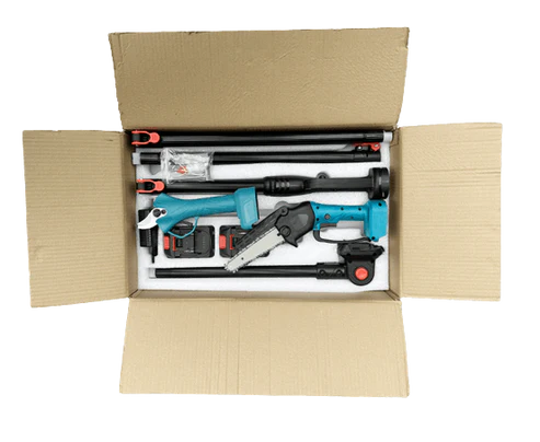 - When you order today, you will receive an 8-inch cordless electric chainsaw, 4-section extension pole, 2 free rechargeable batteries, a battery charger, 8-inch chain,screwdriver, wrench, instruction manual, all packaged in Comes in a sturdy storage box.