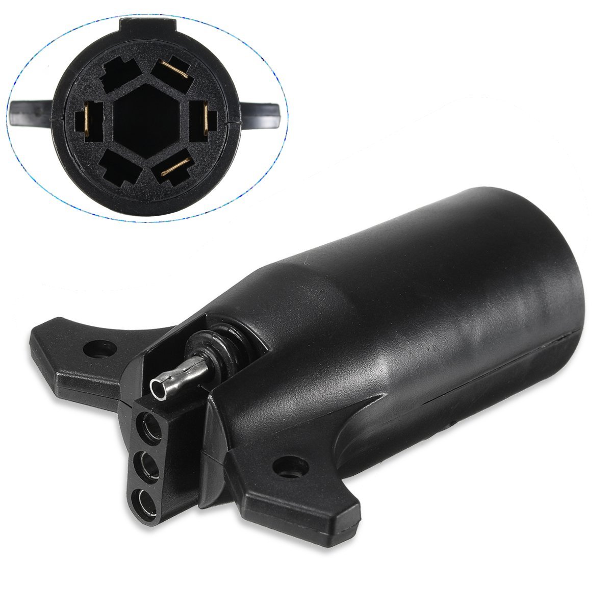 Feature:1.7 way round (tow vehicle end) to 4 pin flat (trailer end).2.Prevents difficulty in plug removal.3.Non-corroding, shock-resistant interior design.4.Vinyl inserts keep out dirt and moisture.5.Ensures connector is plugged into socket.Specification:1.Color: Black2.Material: Plastic3.Type: 7 way to 4-pinNote: