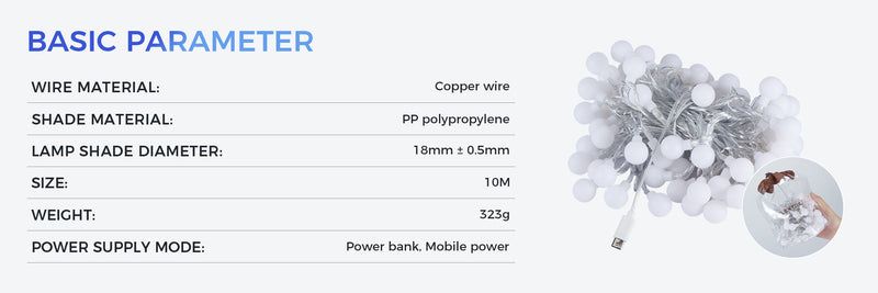 The length of LED ball string lamp is 10M, which can meet various distance requirements. Wide range of light sources, providing stable and bright light sources.