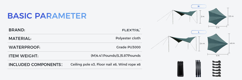 The waterproof camping tarp is made of 600D Oxford material with PU3000 waterproof coating. Protect you and your belongings from moisture and sunlight. Equipped with stronger tarp poles to provide more stable support.