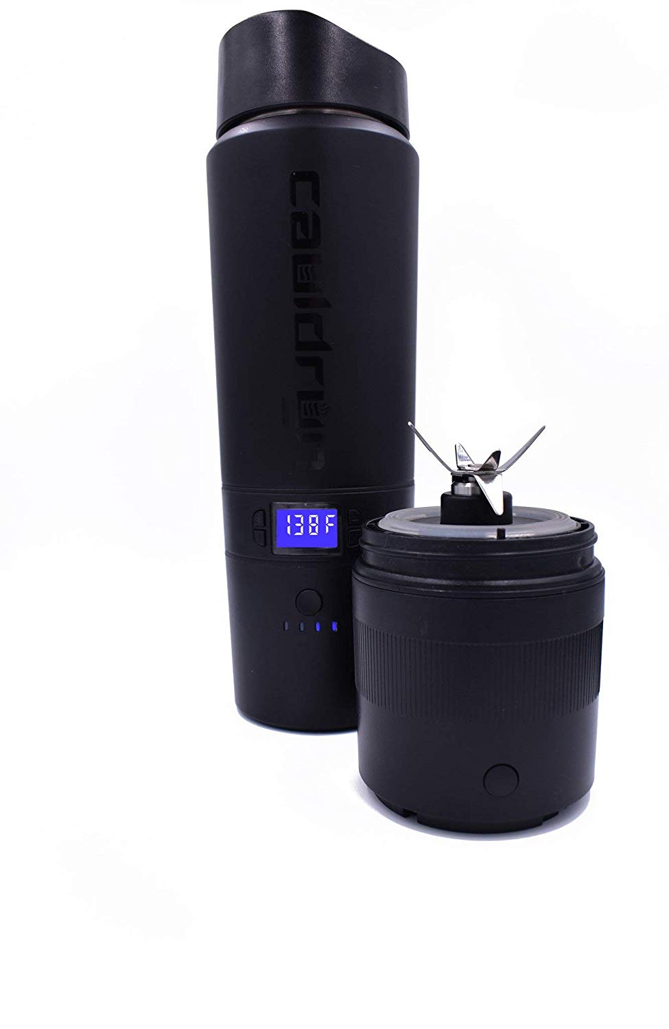 CAULDRYN COFFEE’s design is modular. That means that the battery and heating element are removable for easy cleaning and to allow for connecting optional attachments like our blender that can chop ice. It turns your CAULDRYN COFFEE into a mobile smoothie/frozen drink machine.