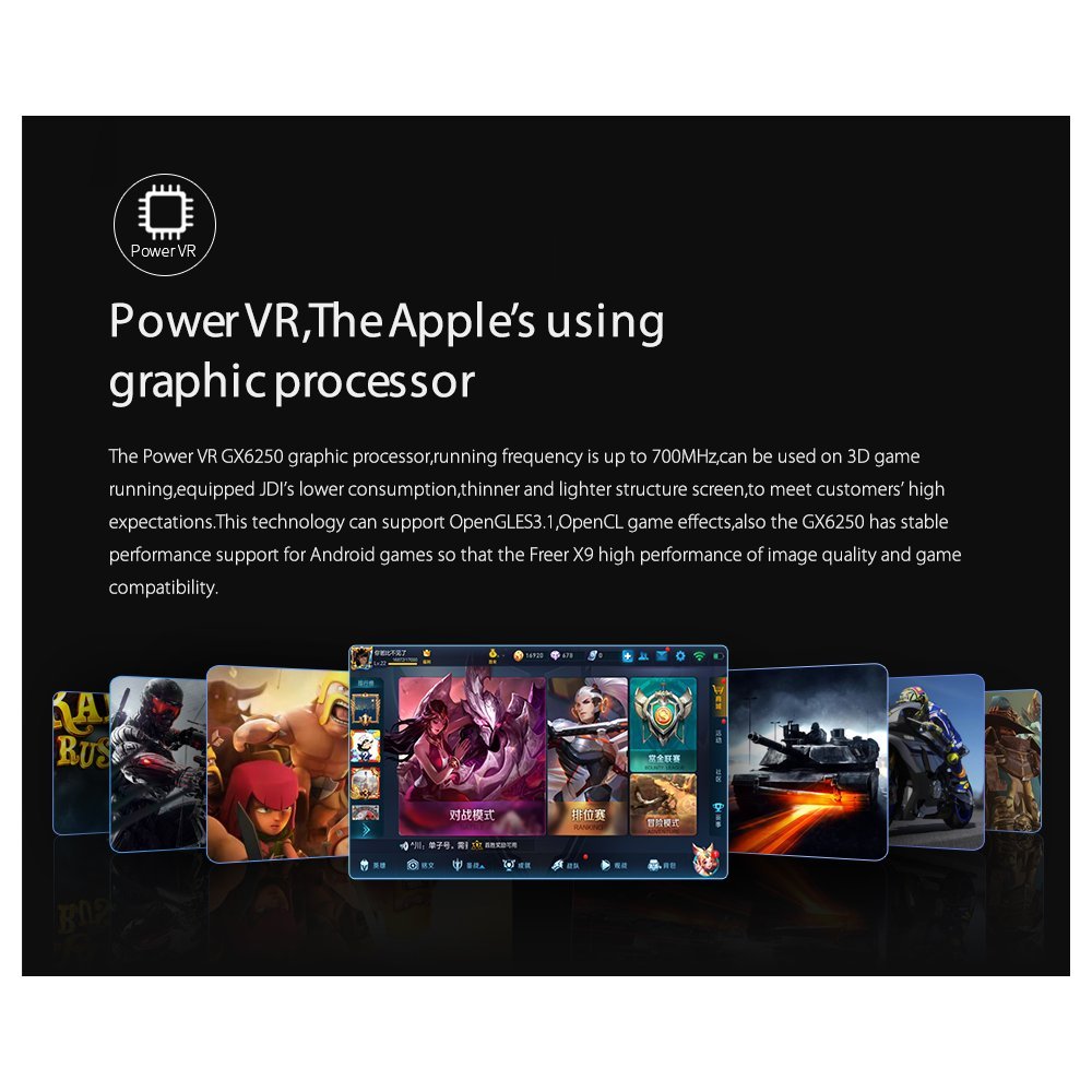 This technology can support OpenGLES3.1, OpenCL game effects, also the GX6250 has stable performance support for Android games so that the Freer X9 high performance of image quality and game compatibility.