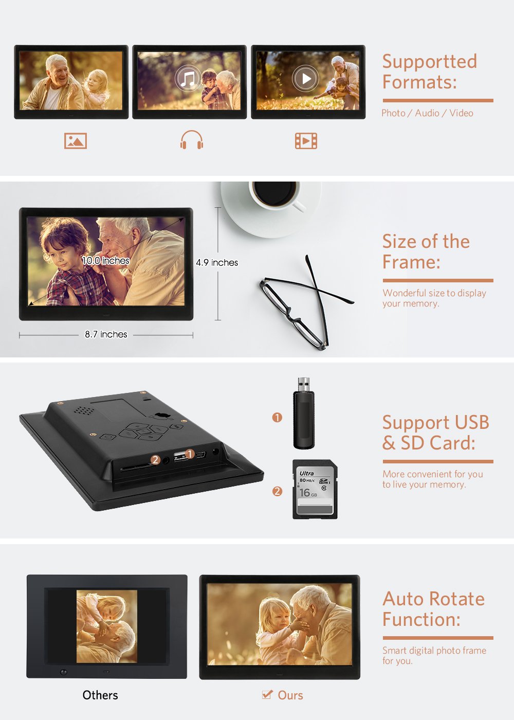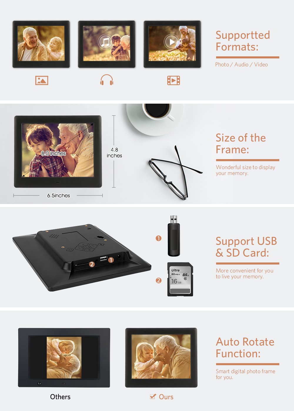 →Our digital photo frames are the perfect gift for you to share your memories in your home. It’s convenient for other media uses as it can also play video and music too.