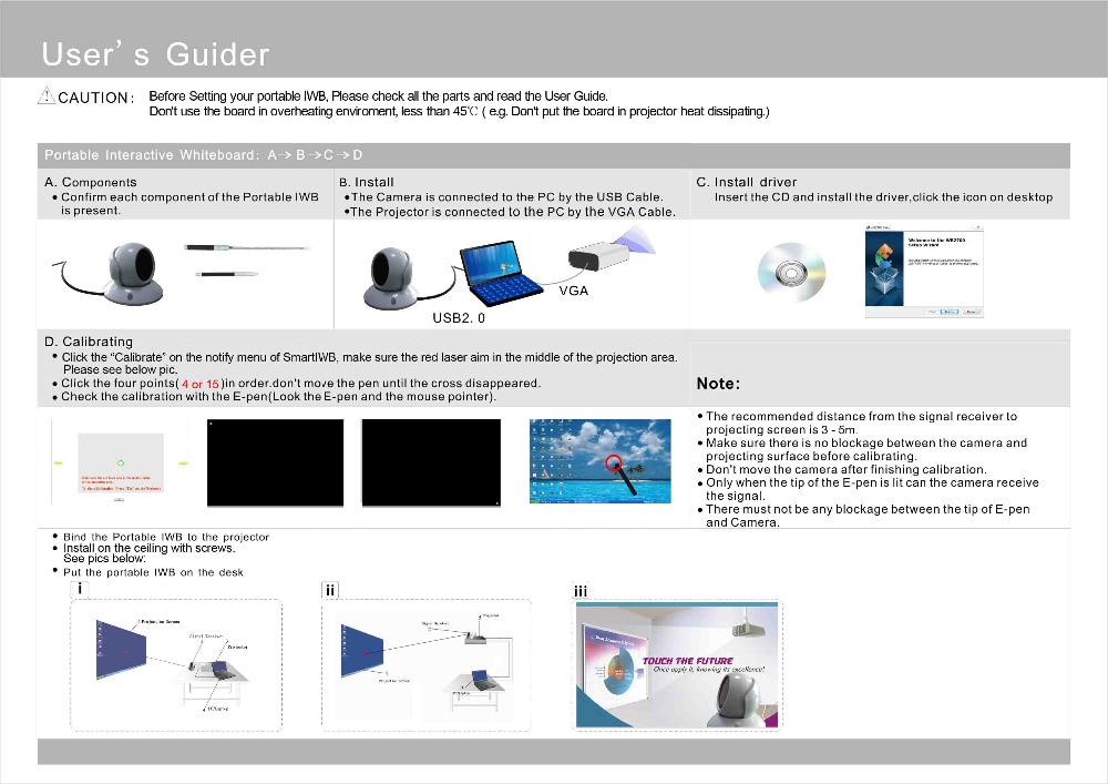 Simple and easy installation method. Portable Interactive Whiteboard WB2700 makes the user’s investment and maintenance’s costs down to the minimum. This interactive teaching system transforms any standard dry wipe whiteboard, flat surface or wall into an interactive whiteboard.