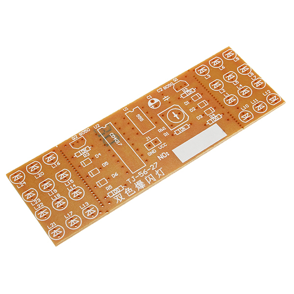 Description: The suite,adopt a warning lamp circuit NE555 and CD4017 chip simulation to make blue LED and red LED flashing,respectively, according to the pulse adjusting RP1 flicker frequency can be adjusted. Working circuit voltage of DC9-12 v,suite does not contain the power (battery). The suite is easy to make, obvious effect, interesting,suitable for electronic enthusiasts and vocational school students’ practical assembly. Package included: 1 x NE555 + CD4017 Double color flashing lights kit