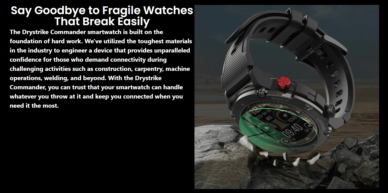 Tired of wasting money on devices that can’t withstand a simple drop? Look no further than the Drystrike Commander, the ultimate rugged smartwatch designed to help you reach your fitness goals and endure any challenge. Say goodbye to flimsy devices and hello to a smartwatch that truly represents your strength and determination.