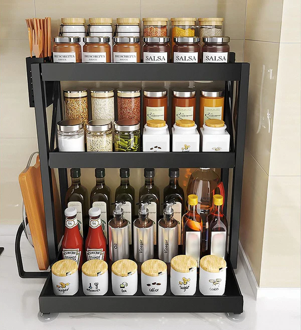 • Sturdy & Non-Slip Fee: The black stainless steel spice organizer for the kitchen counter is designed with a thickened square tube and an “H” shaped frame, ensuring the rack is stable and balanced. The spice shelf organizer is a high load bearing 99 lb for each tier. There are 4 rubber feet in the bottom to prevent it from slipping, falling, or shaking.