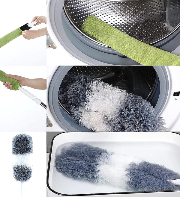The telescopic rod type dust collector cleaning kits includes a 3-6 foot special extension rod, a double-ended fiber dust collector, ceiling duster, an extended lint drum , and a universal clothes fork.