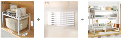 - Stackable Function: The expandable organizing shelf can be stacked on another shelf, which adds more space in your cabinet, kitchen or under the sink.