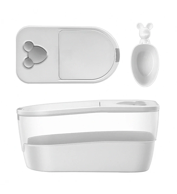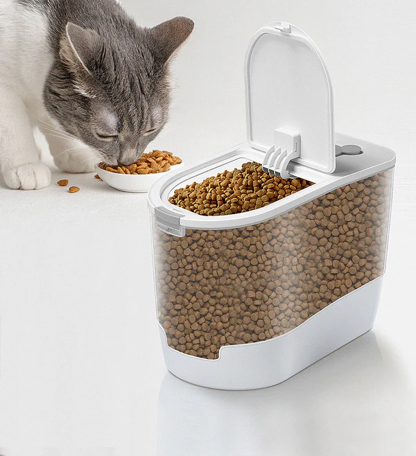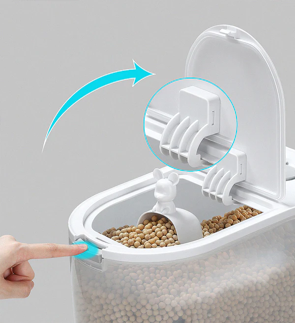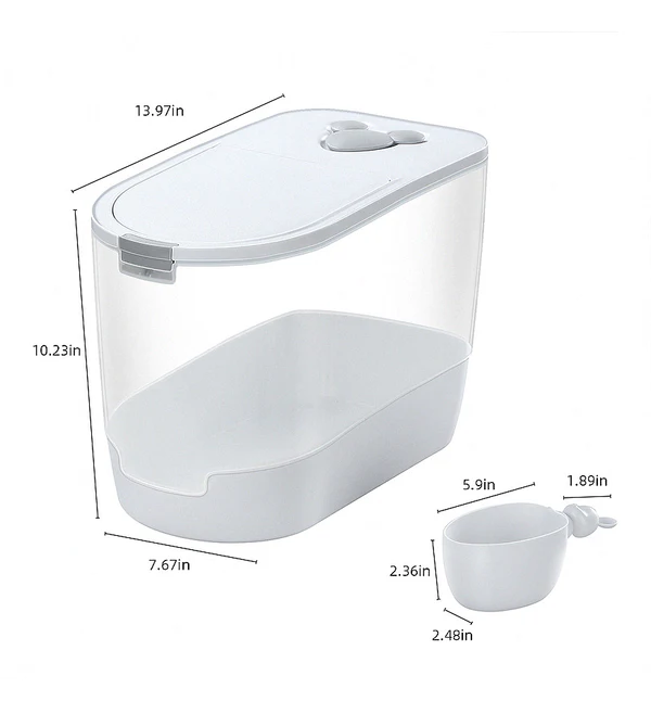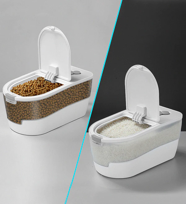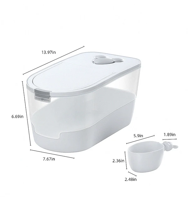 - Measuring Cup & Easy to Use: The food storage container’s lid open/close button & 200ml measuring cup, provide a convenient pouring and clean. On/close button, help you to keep out moisture and secure dry food storage. Which can easily keep on your pet’s steady diet by measuring the same amount with a measuring cup.
