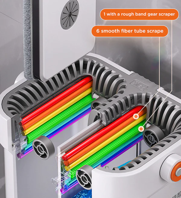 - All-IN-ONE Flat Mop and Bucket System, 2 separate chambers in the bucket for washing and drying, scraper blade in WASH to scratch away any dirt, hair or dust, scraper blade in DRY to squeeze extra water, no water left after moping.