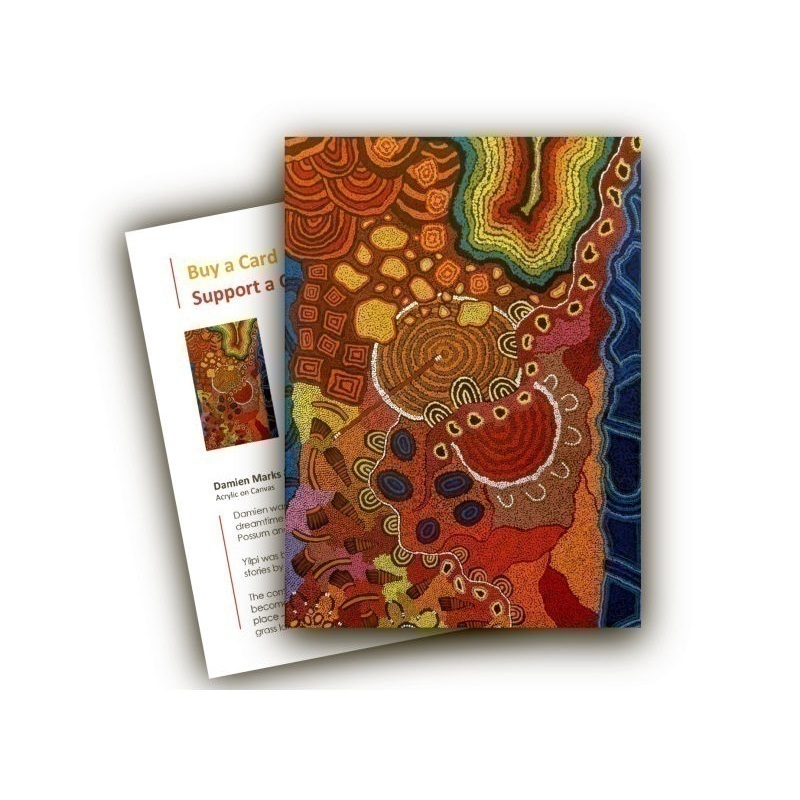 A5 Greeting Card. Artist: Damien Marks was born in Haasts Bluff in 1967. He was taught to paint dreamtime stories at an early age. Yilpi Marks was born in Ernabella in 1969. She was taught the dreamtime stories by her grandparents.