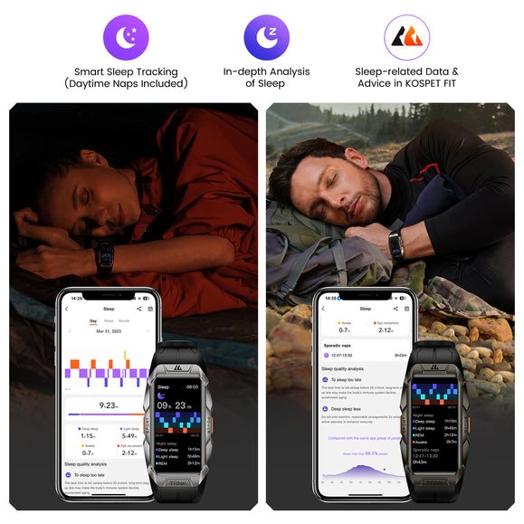 - 🏊♂️ 24H Smart Sleep Tracking, Daytime Nap Tracking- Follow your dreams with smart band through major stages of sleep including light sleep, deep sleep, and rapid eye movement (REM). On waking up, you can view sleep data directly in KOSPET FIT App. More remarkably, even short naps during the day over 30 minutes can be monitored in detail.