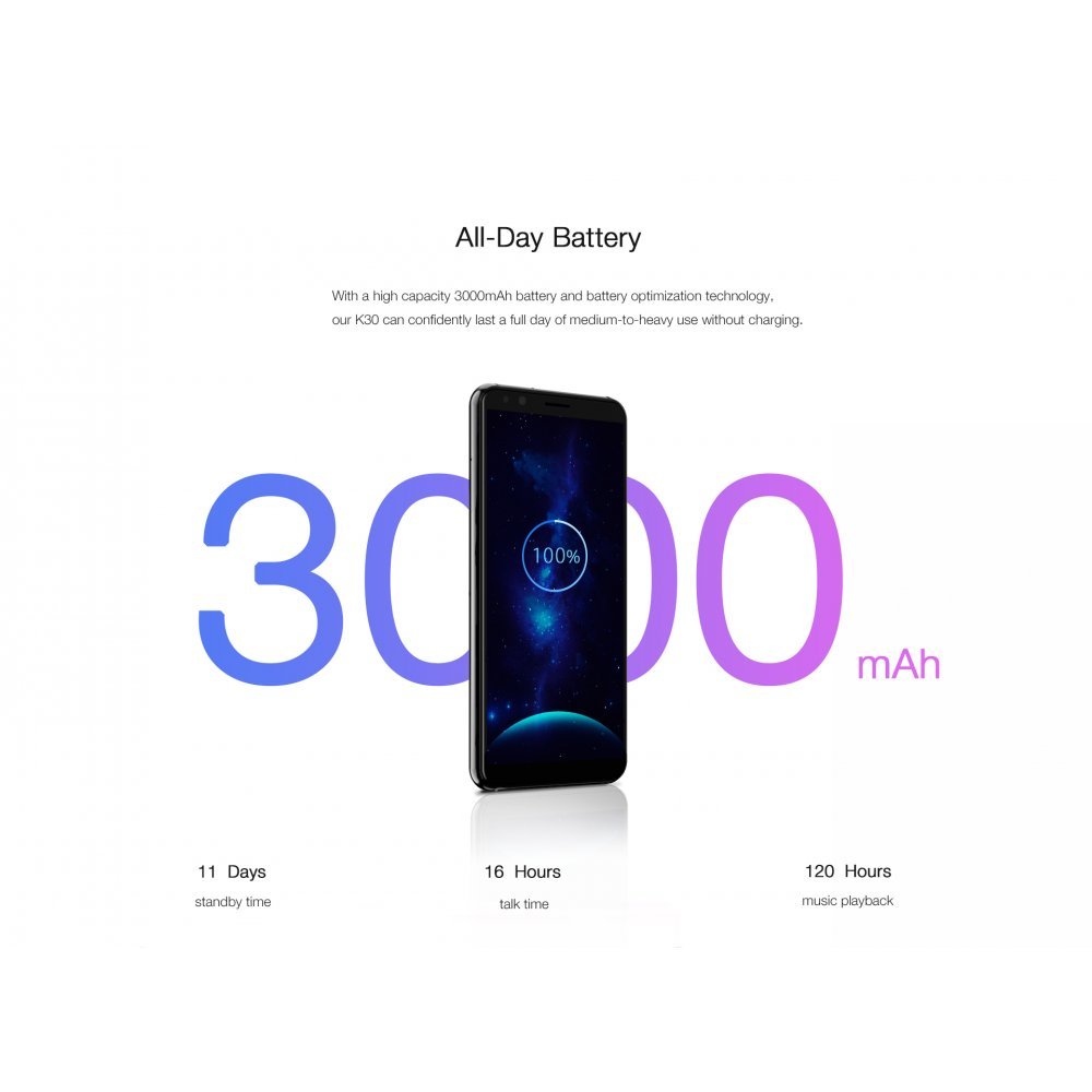 - With a high capacity 3000mAh battery and battery optimized technology, our K30 can confidently last a full day of medium-to-heavy use without charging.