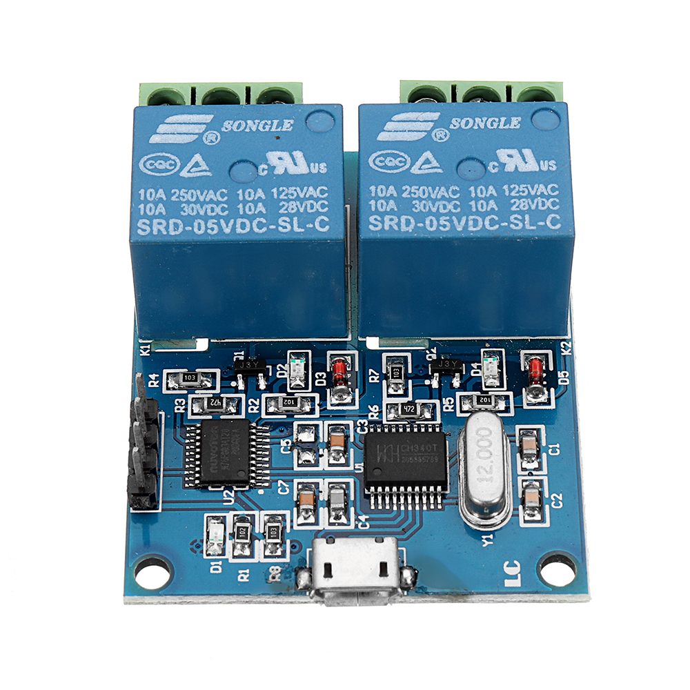 Overview:LCUS-2 USB relay module equipped with stable performance USB to serial chip and microcontrollers, you can control the two relay on and off by send serial command on the computer. Feature: 1. Onboard high-performance microcontrollers chip2. Onboard CH340 USB control chip3. Onboard power LED and relay status LED4. Onboard 2-Channel 5V, 10A / 250VAC, 10A / 30VDC relays, relay life can be continuous pull 10 million times5. The module has over-current protection and relay diode follow current protection6. Board size: 50*40mm Communication protocol: The default baud rate is 9600 bpsYou can control the 2-channel relay by send serial command on the PC(the command format is hex)Open the first relay: A0 01 01 A2Close the first relay: A0 01 00 A1Open the second relay: A0 02 01 A3Close the second relay: A0 02 00 A2For example, if we want to open the first relay, just send A0 01 01 A2 on your PC. Package included: 1 x LCUS-2 Dual Channel USB Relay Module