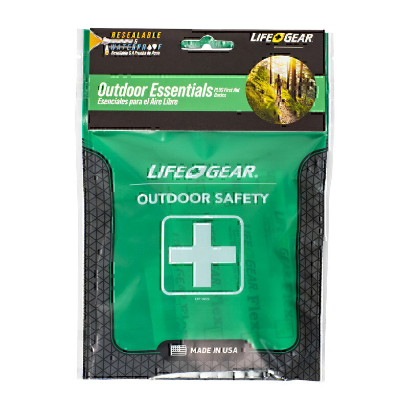 16 piece Lifegear Outdoor Safety Kit includes 4 x Flex fit bandages, 1 x Blister bandage, 2 x antibiotic ointments, 3 x Antiseptic wipes, 1 x Antimicrobial wipe, 1 x Lip balm, 1 x BugX insect repellent, 1 x Muscle gel, 2 x SunX Sunscreen SPF 30