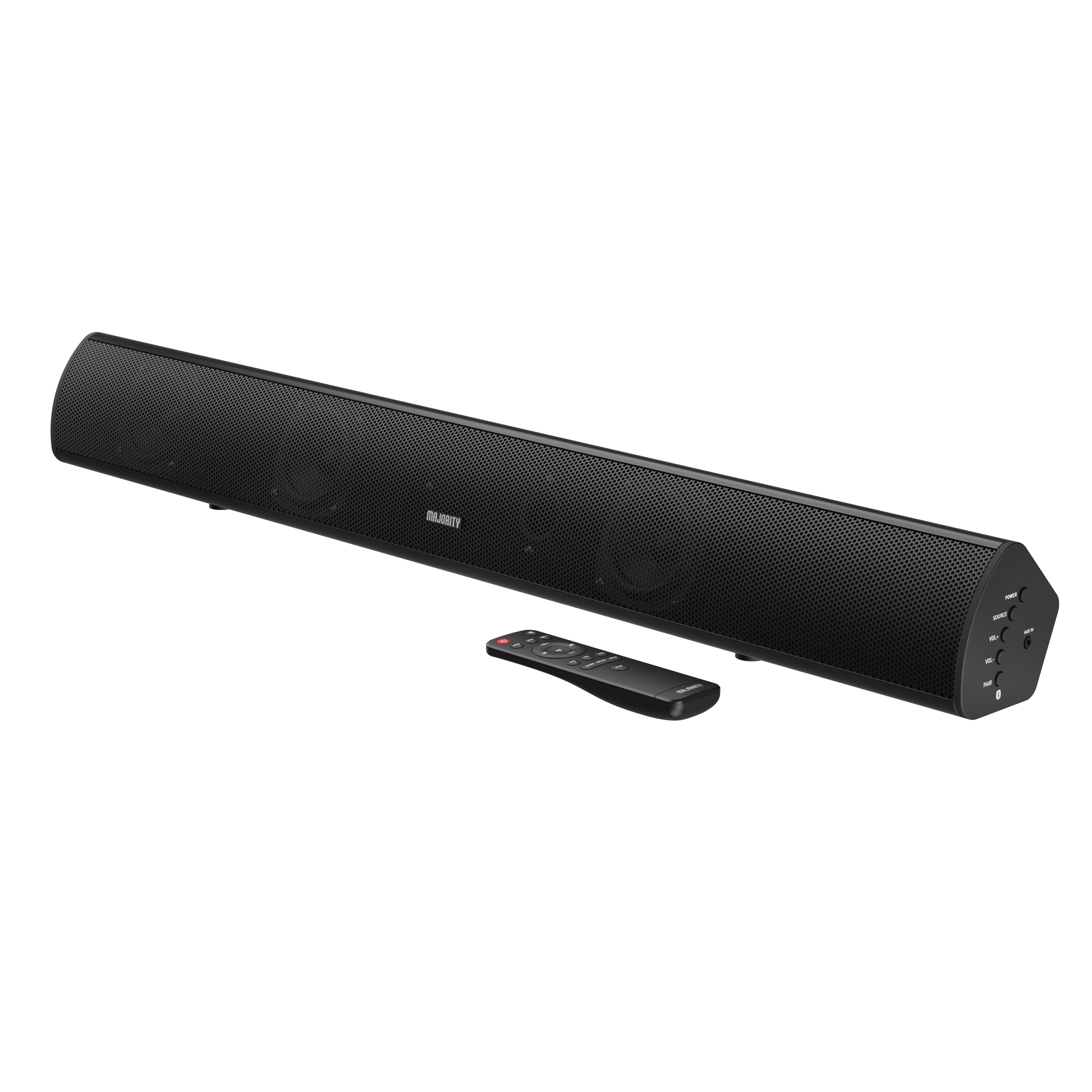 Majority Teton Soundbar – ROOM-FILLING SOUND: With 2.1 Channel Sound, the Teton offers a superior audio experience for any home entertainment set-up. MULTI-CONNECTION: The Teton boasts a wide range of connections including Bluetooth, Optical input, RCA, and AUX-input. The Teton comes with an RCA cable. Designed for the eager audiophile, you can select which mode you want to listen to: Music, Movies or Dialogue. BUILT-IN SUBWOOFER: Delivering high definition sound, the Tetons stereo speakers fill the room with your favourite sounds using the provided remote control. COMPATIBLE WITH TV, PHONE AND PC: Using the range of connectivity options, the Teton can be connected to your phone, computer and most TVs using Bluetooth, Optical Input and RCA input.