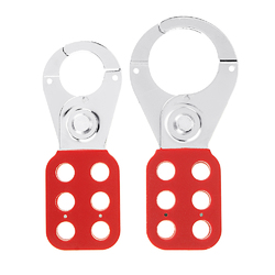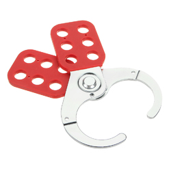 1.When this hasp is closed, the two halves of its handle overlap like scissors, and the six holes in each half of the handle align to create six locking holes, any of which, when blocked by a padlock (sold separately), obstruct the hasp’s jaw from opening and allowing access to the locked out device or energy source.