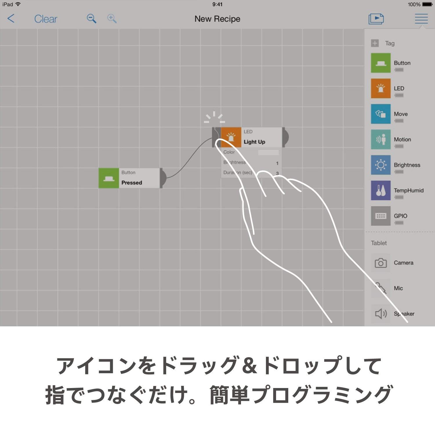 The visual coding app simplifies programming and replaces the traditional soldering process and programming with an intuitive drag-and-drop canvas. In the canvas, you can create recipes that visually connect sensors, logic, and web services and gadgets on IFTTT for your project.