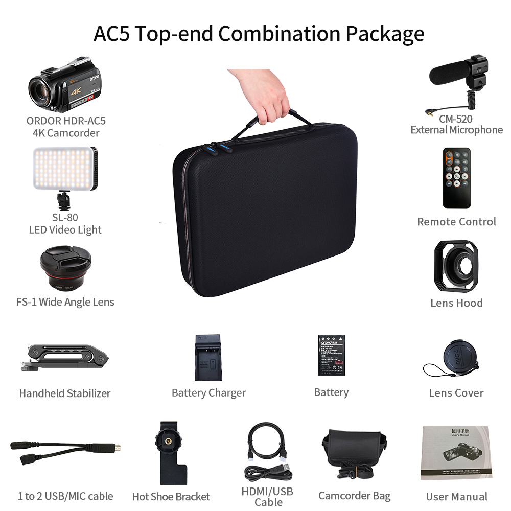 1 * AC5 12X Optical Zoom Camcorder 1* External Microphone 1* External LED Filling Light 1* External Wide Angle Lens 1* Lens Hood 1* Handheld Stabilizer 1* Hot Shoe Transfer Bracket 1 * NP-120 Lithium Battery 1 * User Manual(English) |