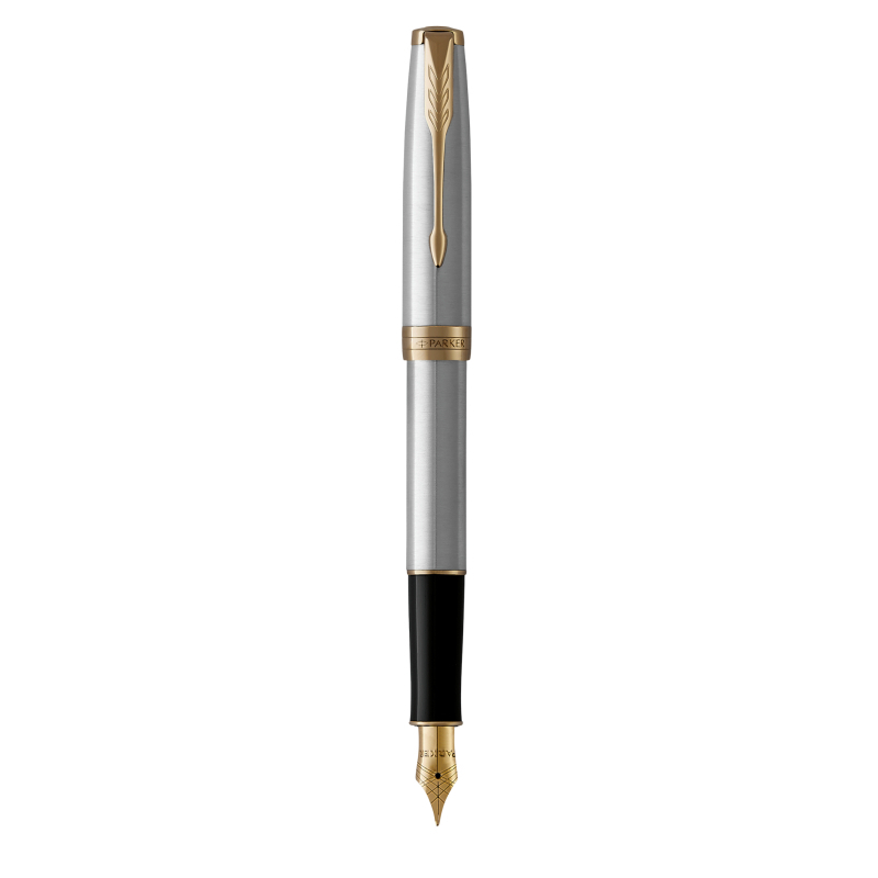 Parker Sonnet Stainless Steel Gold Trim Fountain Pen is Parkers symbol of elegance. With an array of designs, including the enduring Cisel pattern, every detail is skillfully executed.