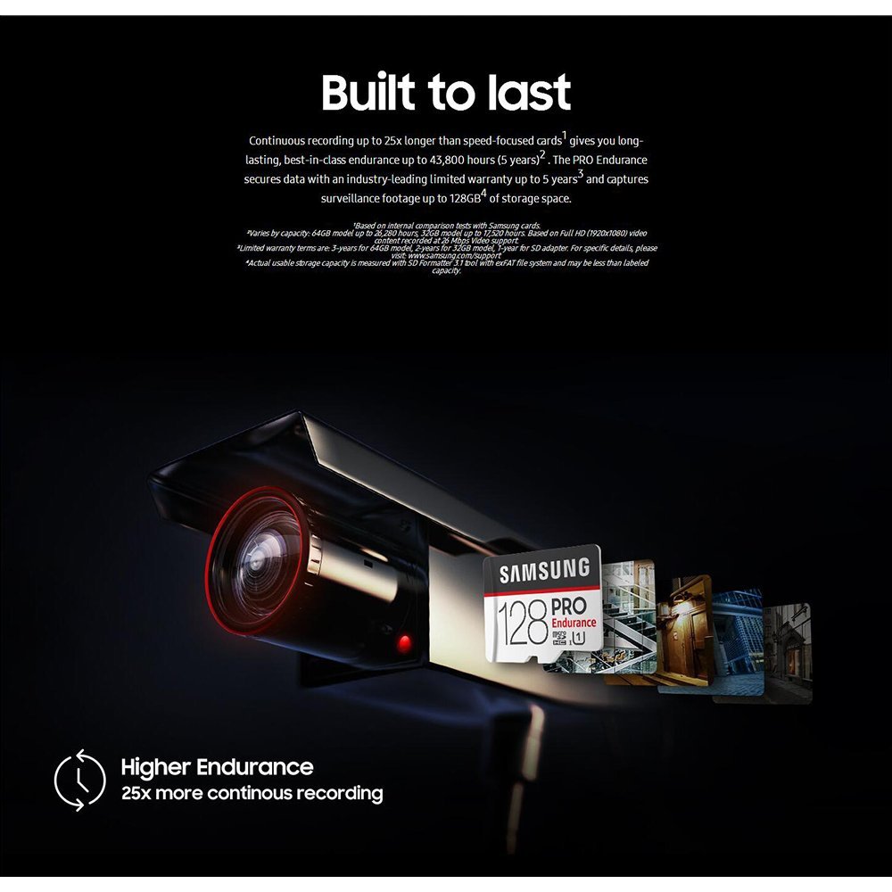 • Continuous recording up to 25x longer than speed-focused cards gives you long-lasting endurance up to 43,800 hours (5 years). The PRO Endurance secures data with an industry-leading limited warranty up to 5 years and captures surveillance footage up to 128GB of storage space.
