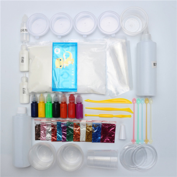 Package Include:1*Storage box1* Bottle Of Water Glue1* Bottle Of Softener1* Bottle Of Hardener1*Sack of Styrofoam Beads Balls1*Sack of Clay1*Pastry Bag1*Pastry Bag Nozzle2*100ml Measuring Cup storage box2* Bottle Of White Glue3*Tools1*Bottle Of Softener4*Empty Box With Lids5*Small Scoop(Random Colors)5*Jelly Jar With Lids7*10ml Pigment(Random Colors)12*Sack of Glitter Powder