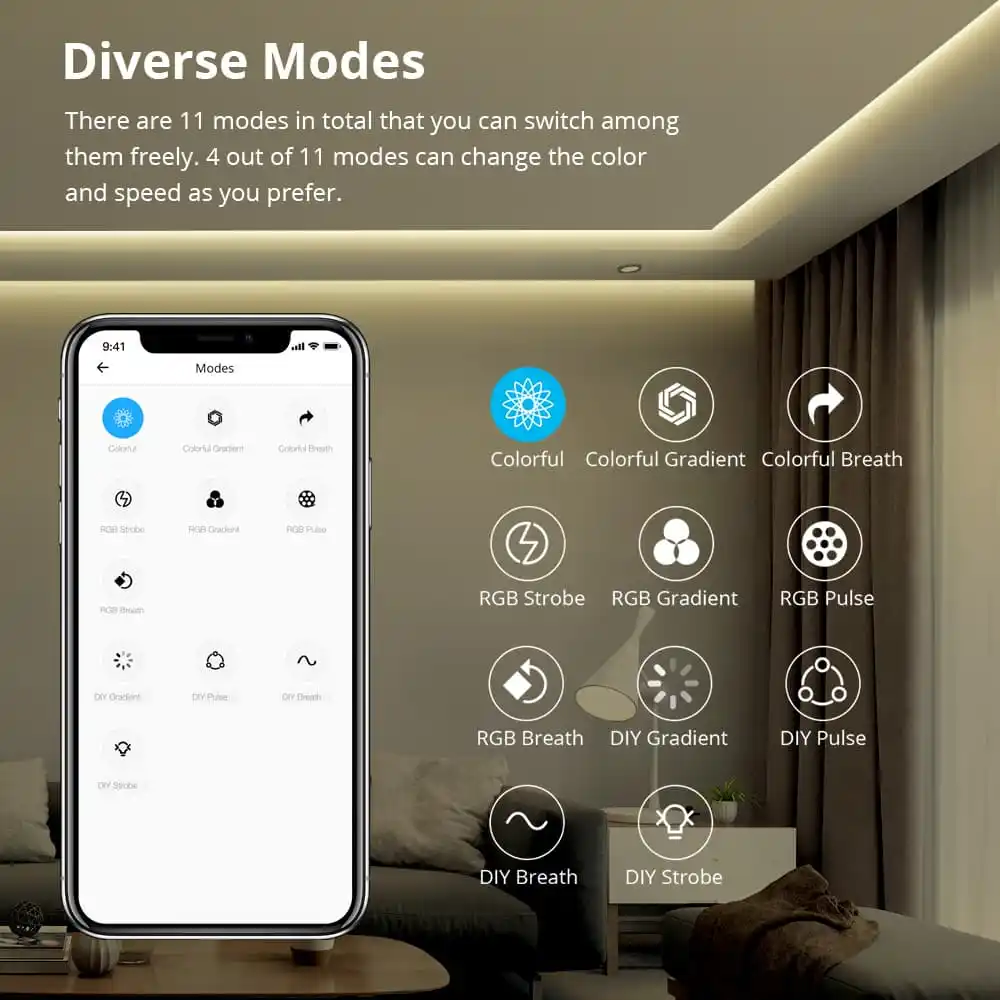 【Diverse Modes】11 build-in modes, 4 out of 11 modes can change the color and speed as you prefer.
