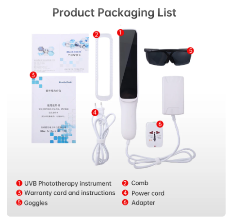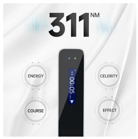 - The UVB 311NM phototherapy device emits a precise wavelength of light that penetrates the skin, encouraging the regeneration of pigment-producing cells in vitiligo and slowing the overproduction of skin cells in psoriasis. Regular use can lead to significant improvement in the appearance and health of your skin.