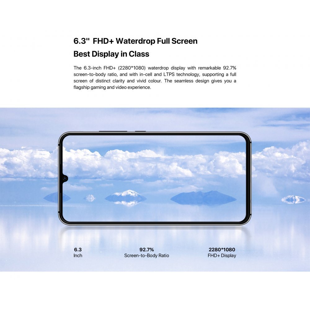 The 6.3-inch FHD+ (2280*1080) waterdrop display with remarkable 92.7% screen-to-body ratio, and with in-cell and LTPS technology, supporting a full screen of distinct clarity and vivid colour. The seamless design gives you a flagship gaming and video experience.
