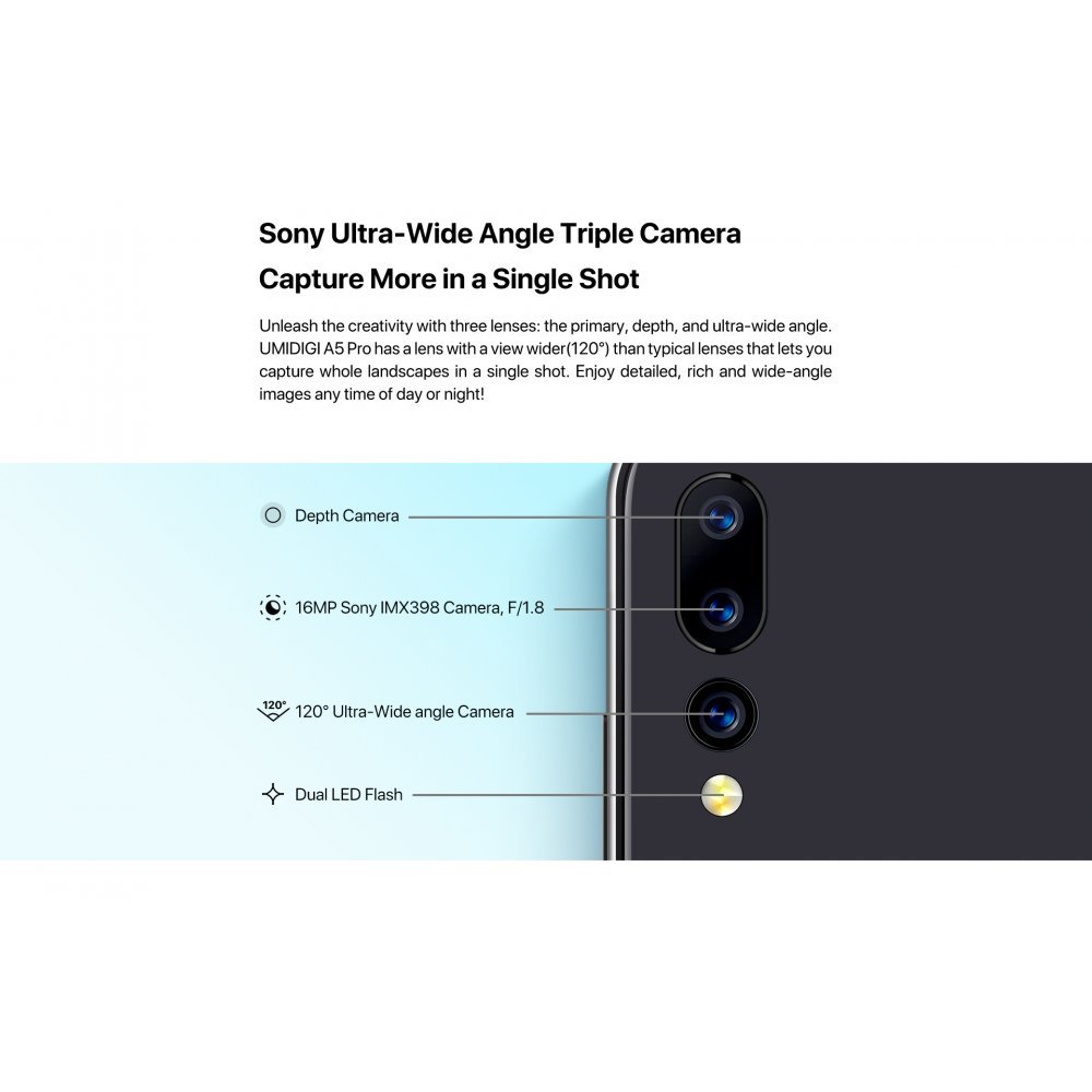 Unleash the creativity with three lenses: the primary, depth, and ultra-wide angle. UMIDIGI A5 Pro has a lens with a view wider (120 degrees) than typical lenses that lets you capture whole landscapes in a single shot. Enjoy detailed, rich and wide-angle images any time of day or night.