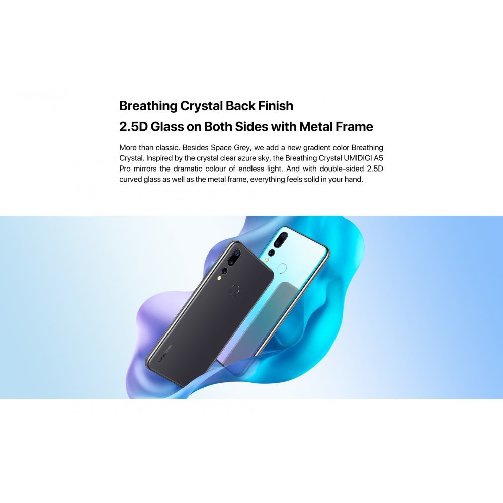2.5D Glass on Both Sides with Metal Frame. Besides Space Grey, we add a new gradient color Breathing Crystal. Inspired by the crystal clear azure sky, the Breathing Crystal UMIDIGI A5Pro mirrors the dramatic colour of endless light. And with double-sided 2.5D curved glass as well as the metal frame, everything feels solid in your hand.