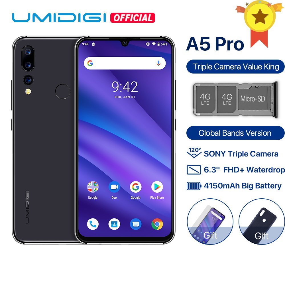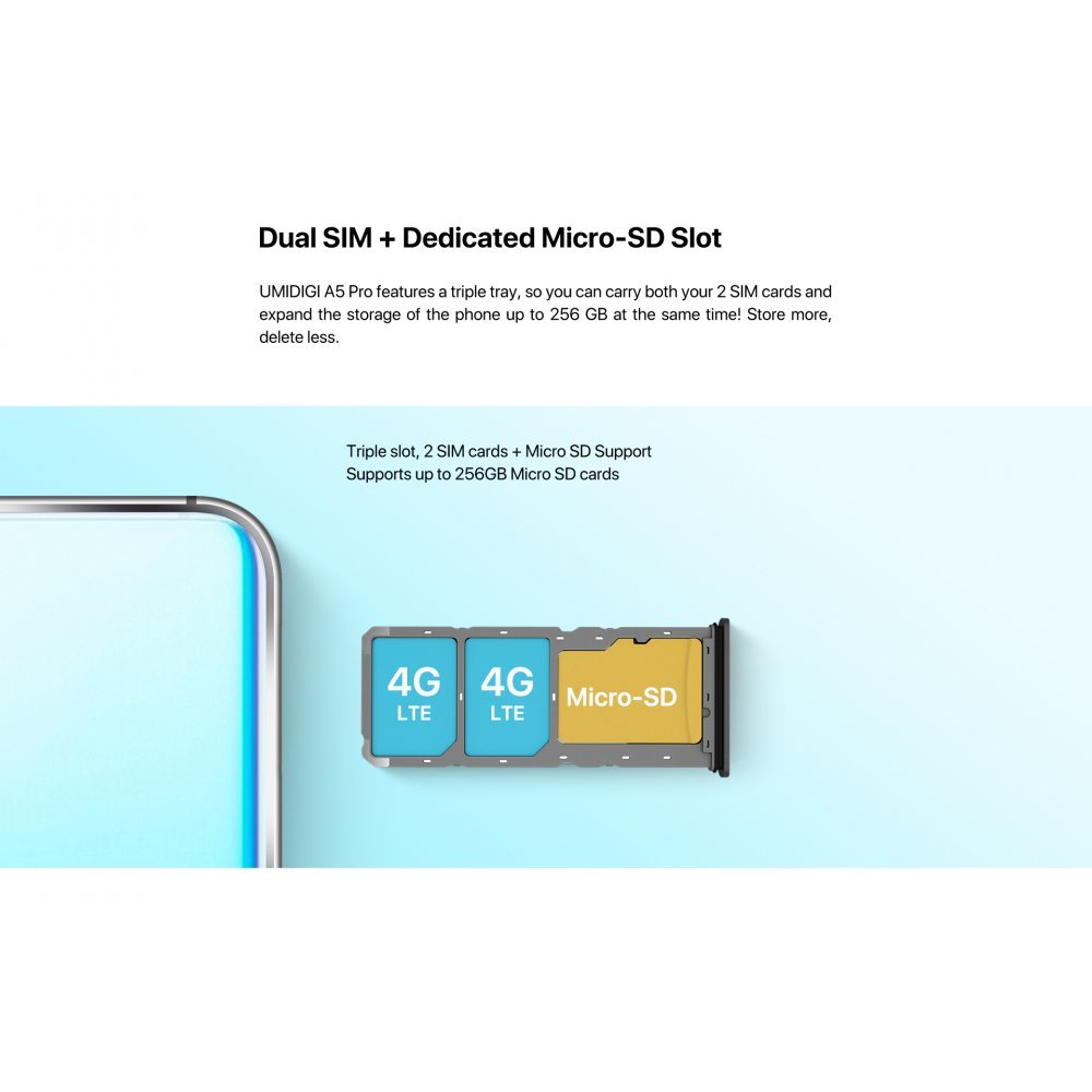 UMIDIGI A5 Pro features a triple tray, so you can carry both your 2 SIM cards and expand the storage of the phone up to 256 GB at the same time! Store more delete less. Triple slot, 2 SIM cards+ Micro SD. Support Supports up to 256GB Micro SD cards.