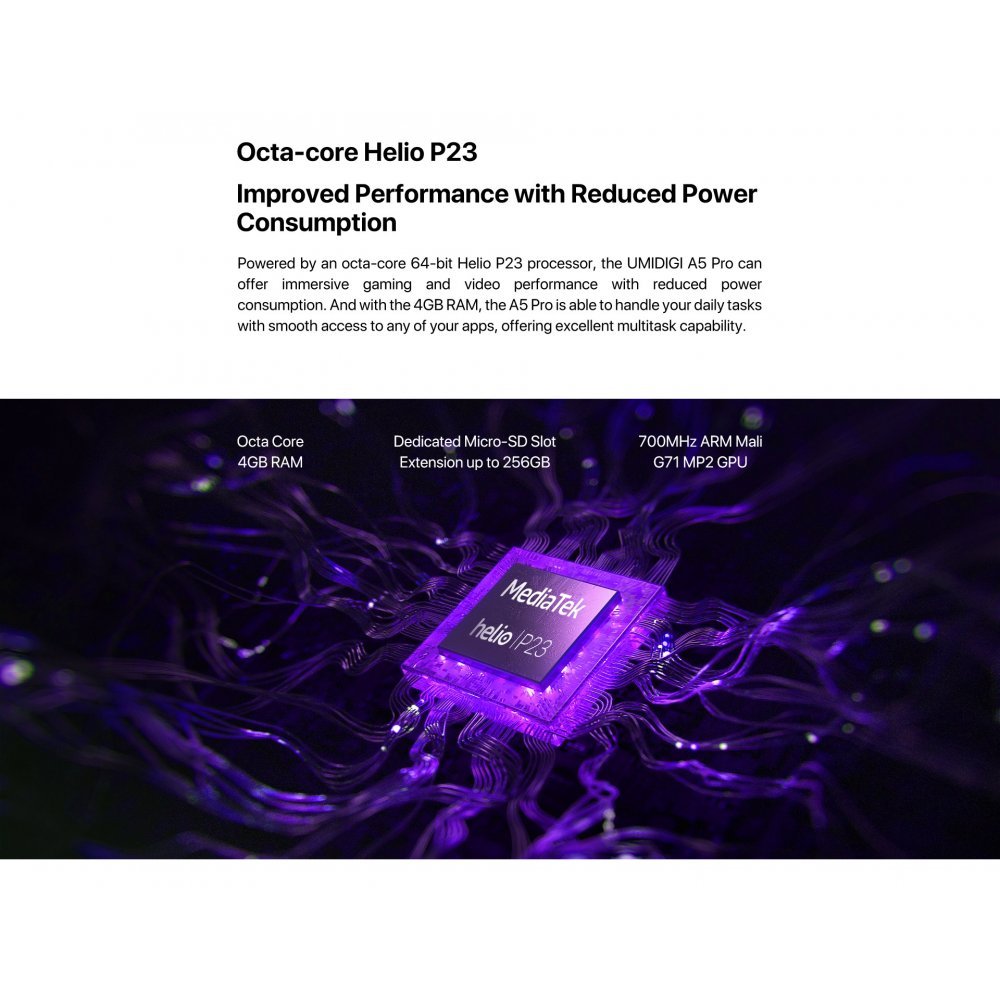Powered by an octa-core 64-bit Helio P23 processor, the UMIDIGI A5 Pro can offer immersive gaming and video performance with reduced power consumption. And with the 4GB RAM, the A5 Pro is able to handle your daily tasks with smooth access to any of your apps, offering excellent multitask capability.