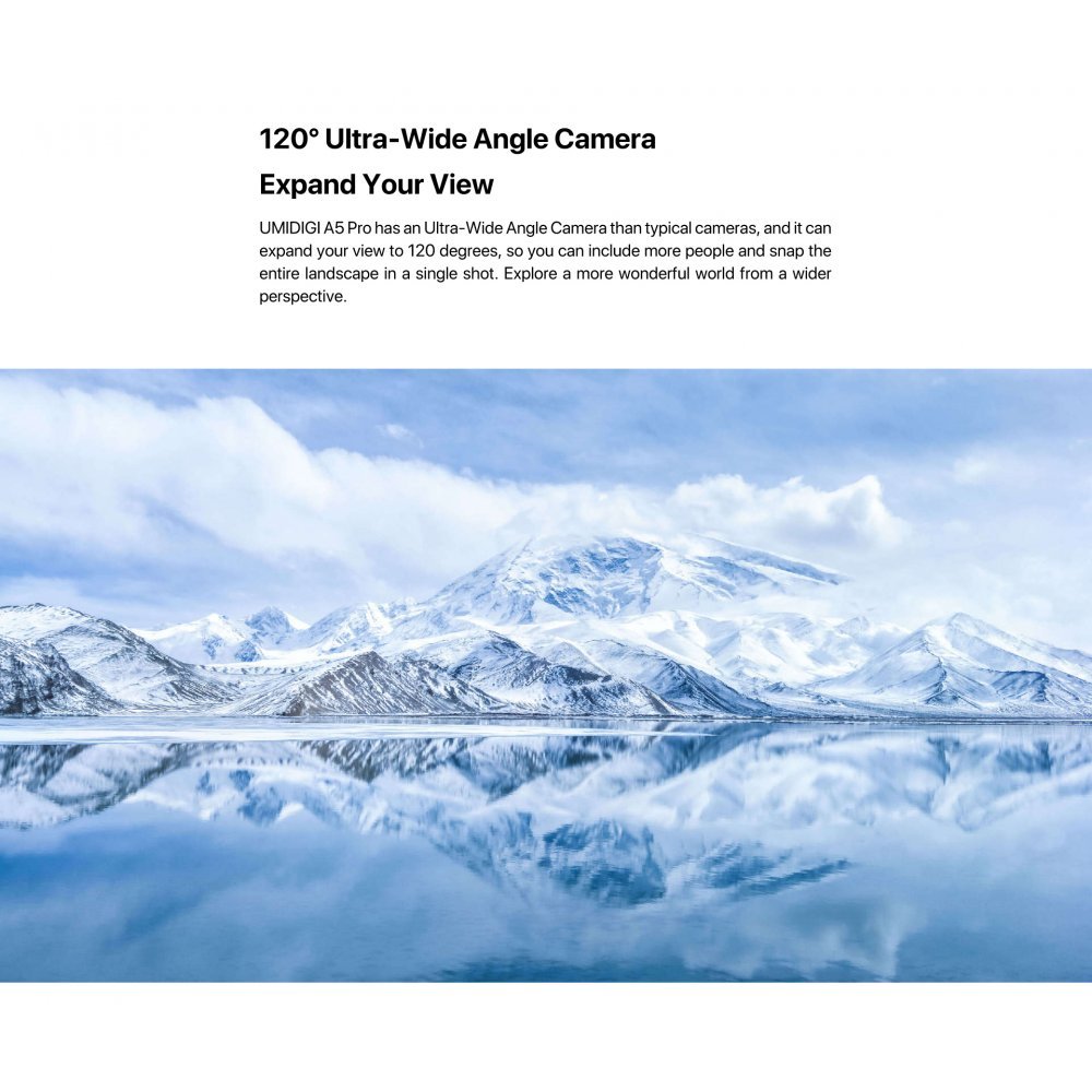 UMIDIGI A5 Pro has an Ultra-wide Angle Camera than typical cameras, and it can expand your view to 120 degrees, so you can include more people and snap the entire landscape in a single shot. Explore a more wonderful world from a wider perspective.