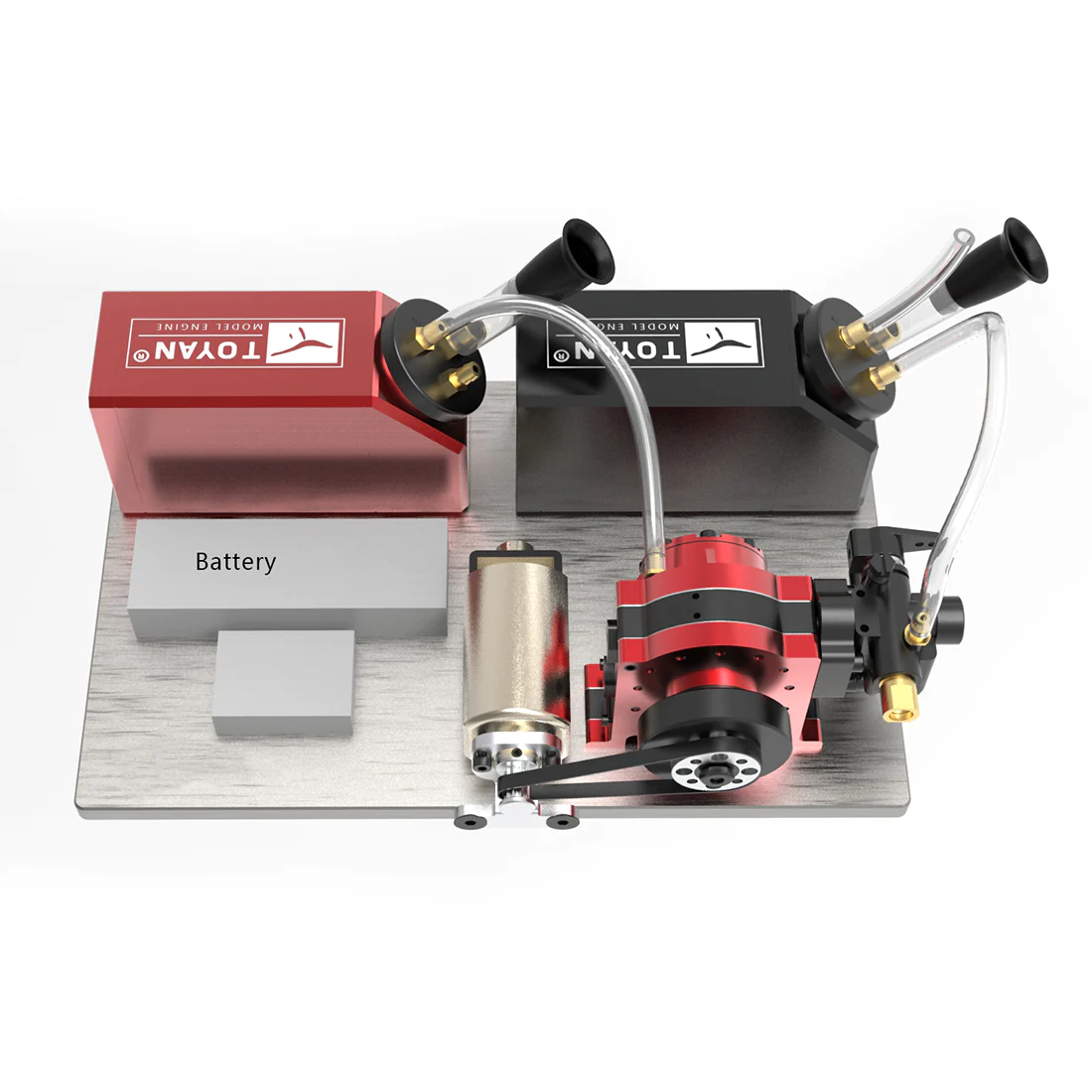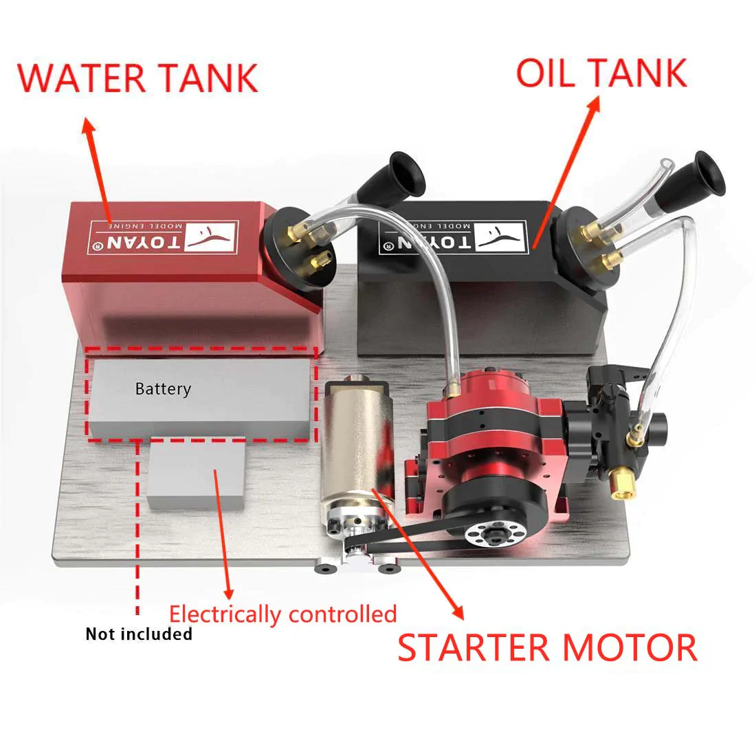- The start kit is suitable for TOYAN single-rotor engine and twin-rotor engine models, including the water tank, oil tank, hose, base, start motor, battery compartment, and start belt.