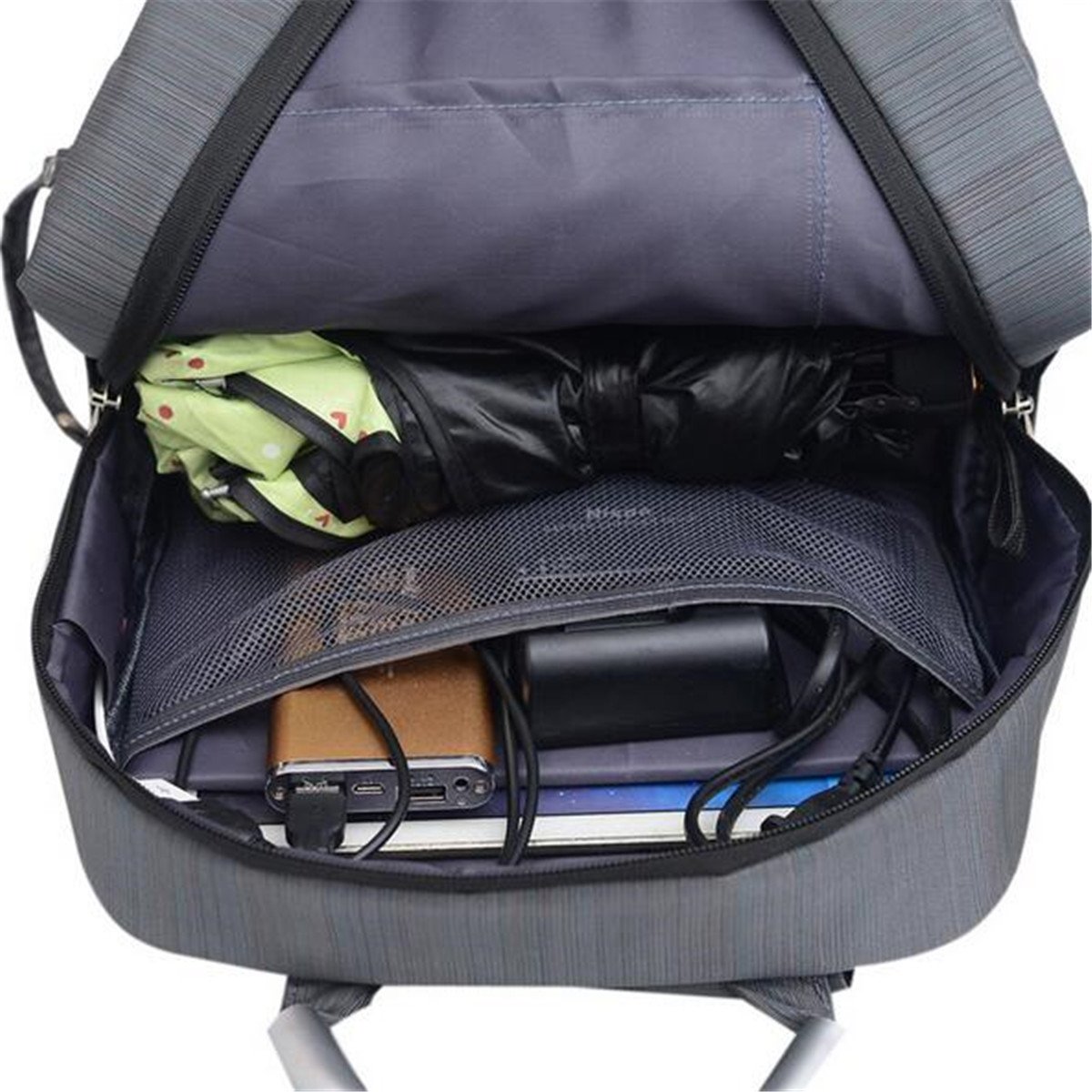Two compartments, upper layer for charger, books, umbrella,etc, second layer with four removable partitions to store camera